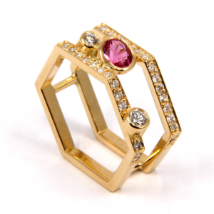 416-00099 Bague Honeycomb en or jaune, diamants et spinelle rose4