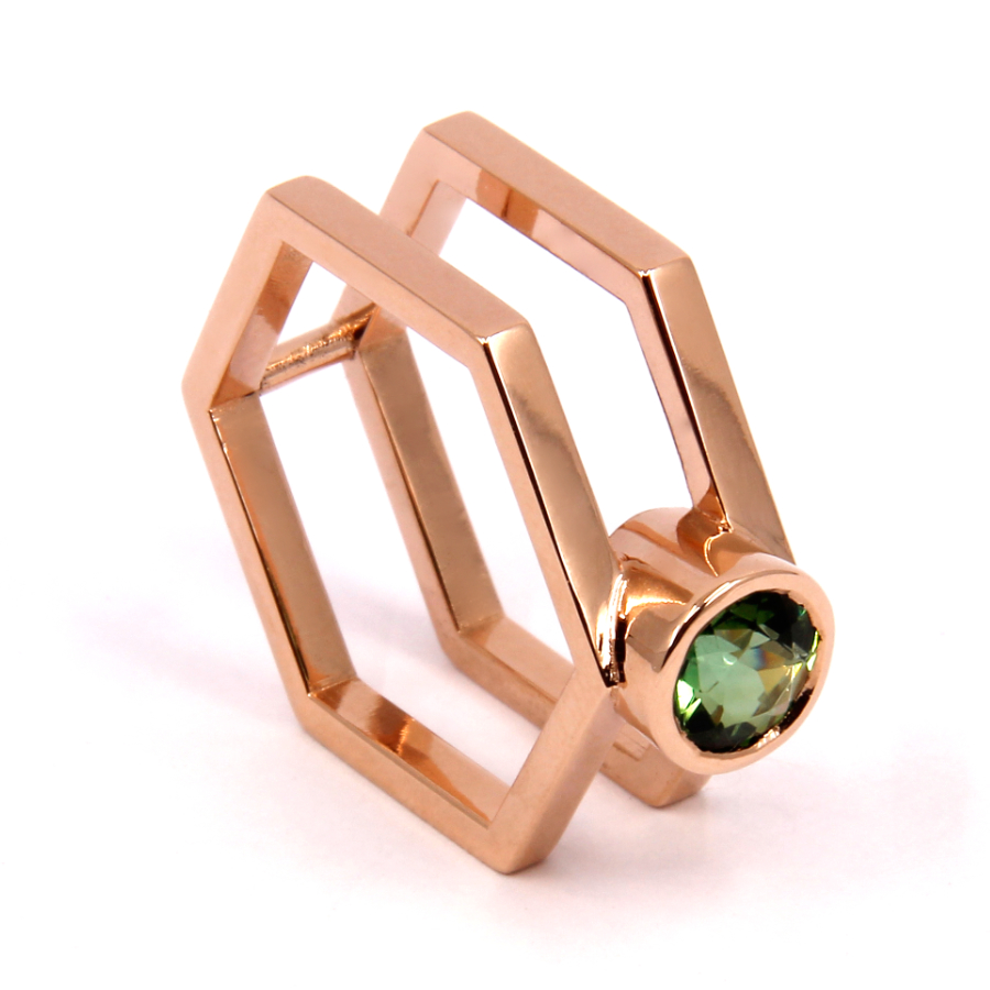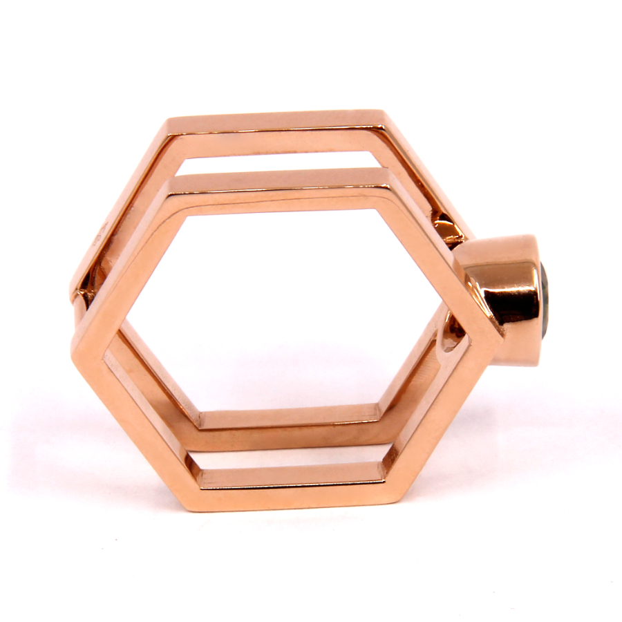 Une bague en forme d’hexagone comme tombée d’un rayon de miel.