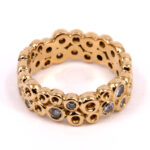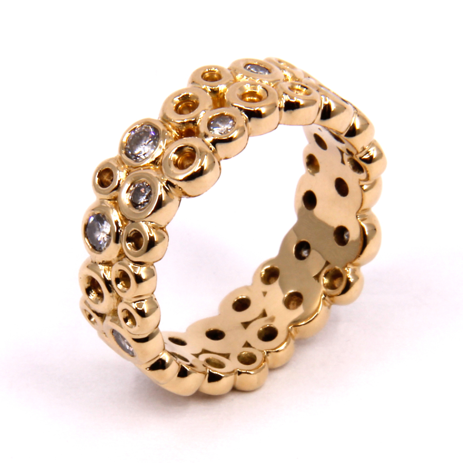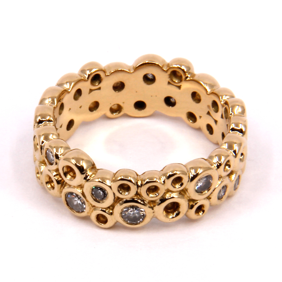 De petits anneaux d’or jaune composent cette bague, donnant l’illusion de bulles dont l’éclat est intensifié par quelques diamants.