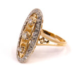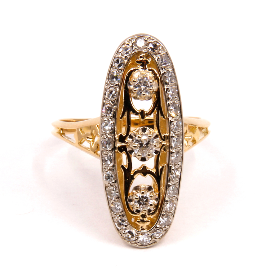 Cette marquise présente un élégant motif floral en or autour des trois diamants centraux et sur le corps de bagues.